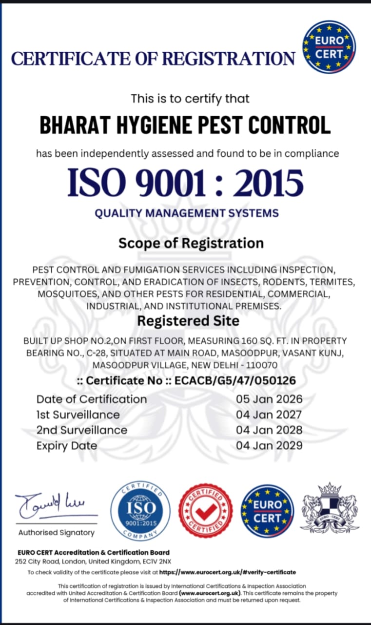 Bharat Hygiene Pest Control is a trusted name in professional pest management, delivering safe, effective, and long-lasting solutions for homes and businesses. With years of industry experience and ISO 9001:2015 certification, we follow strict quality standards to ensure reliable and hygienic pest control services.